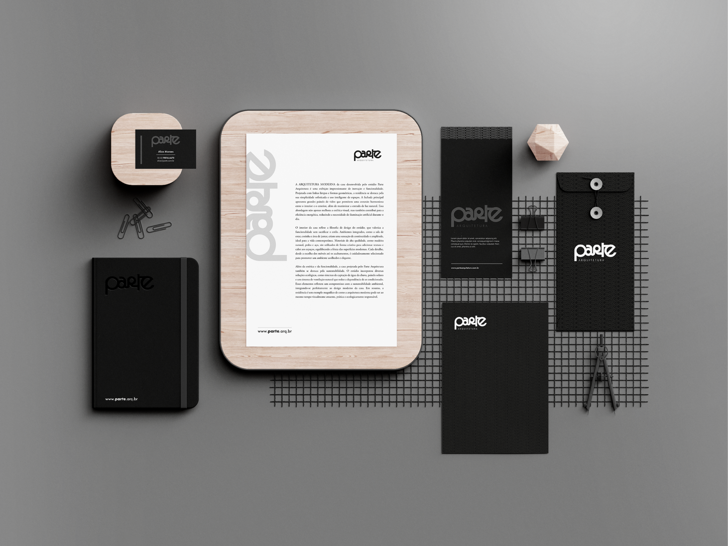 O trabalho de branding desenvolvido para o escritório de arquitetura PARTE começou na captação de briefing para o desenvolvimento de nome da marca. Nossa metodologia costuma inserir os clientes ativamente em todo o processo de naming, visto que nome pode ser algo muito particular. Desta forma, o nome PARTE foi escolhido em conjunto, o que acabou por deixar os clientes e a nós muito satisfeitos. Despois, construímos o logotipo com base em informações que nos agradaram muito, na condição de estúdio de design: os clientes tinham o desejo de ter uma marca modernista, sem cores (apenas os variados tons de cinza), direto ao ponto. Influenciados pelo conceito de “parte” e “todo”, que vem desde Aristóteles, pelo menos, criou-se uma marca em que cada caractere faz parte de um todo: a palavra PARTE.